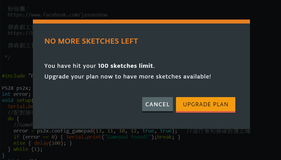 傑森一向習慣直接在Arduino Web Editor上寫程式,然後可以直接分享,還蠻方便的。不過,免費的日子就要結束了,因為傑森的程式已超過100支了!
