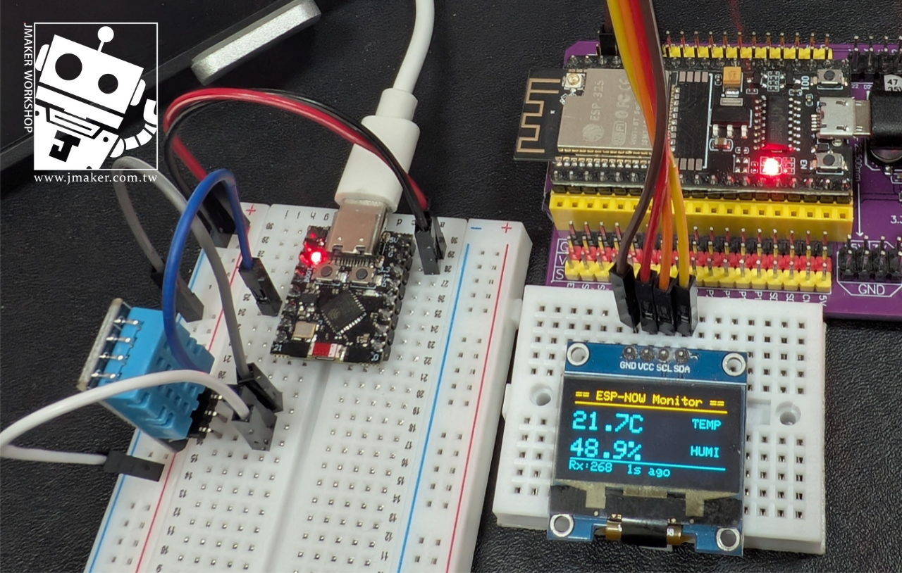 這個專案用兩片不同型號的 ESP32 完成了一組無線溫濕度監測系統。ESP32-C3 負責讀取 DHT11 感測器,透過 ESP-NOW 把資料丟出去;NodeMCU-32S 負責接收並顯示在 OLED 上。整個過程不需要 Wi-Fi 路由器、不需要雲端服務、不需要設定 IP,兩片板子靠 MAC 位址就能直接溝通。