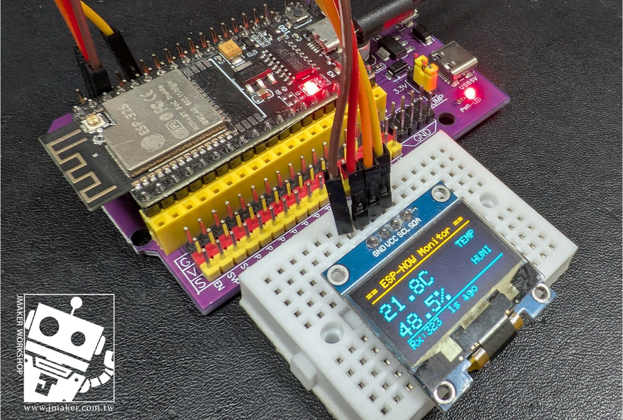 兩片 ESP32、一顆溫濕度感測器、一個小螢幕,不用連WiFi網路、不用架伺服器,就能讓 A 板偵測到的溫濕度,隔空出現在 B 板的 OLED 上。這就是 ESP-NOW 好玩的地方,簡單、直接、幾行程式就搞定。