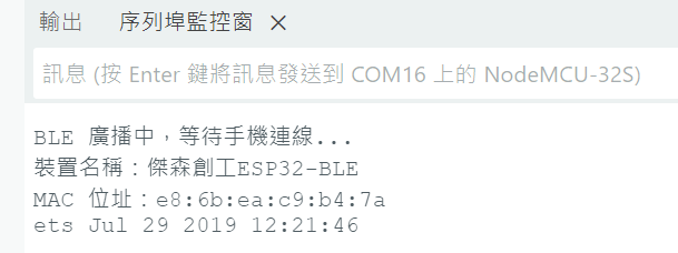 Serial.println("裝置名稱:傑森創工ESP32-BLE");
