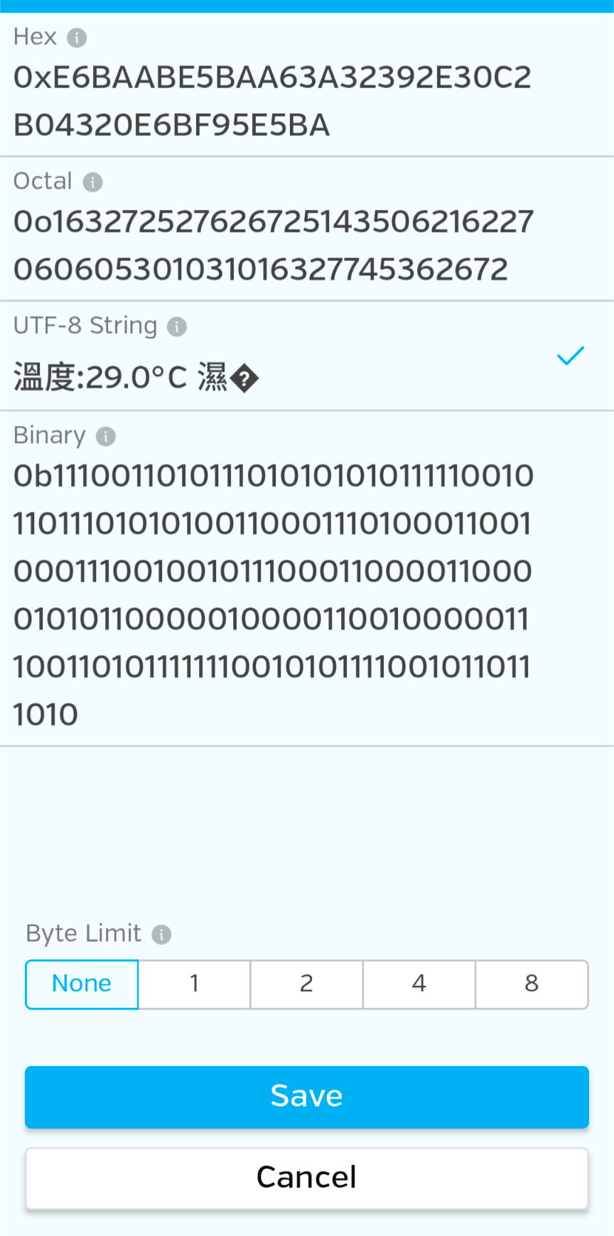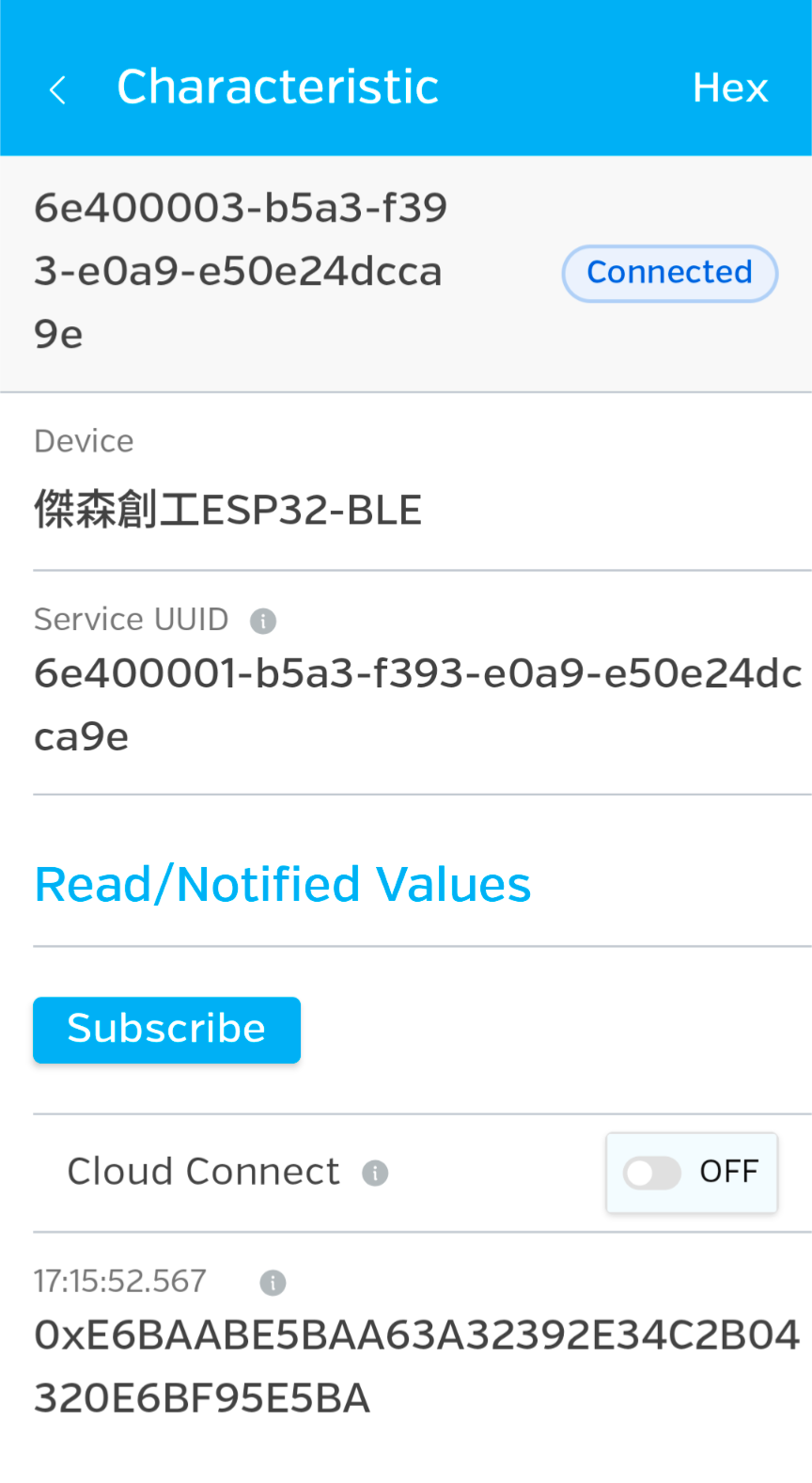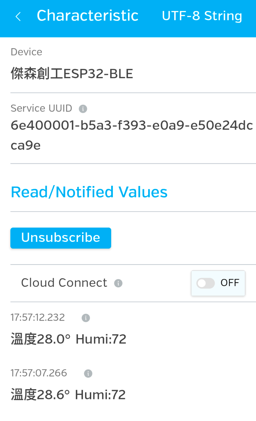 6E400003)→ 點「Subscribe」開啟通知 - 選擇「UTF-8 String」,之後就可以每隔5秒看到一次溫濕度囉!