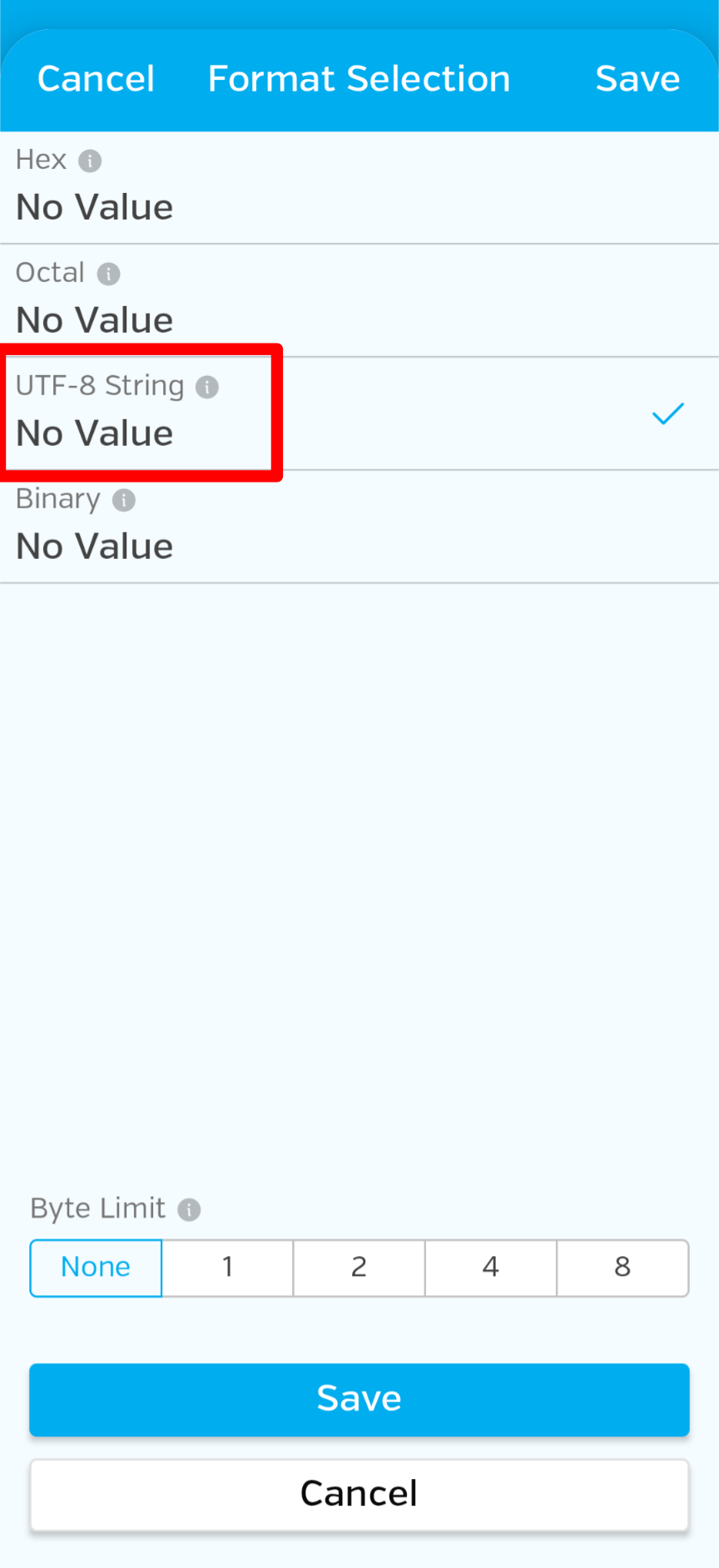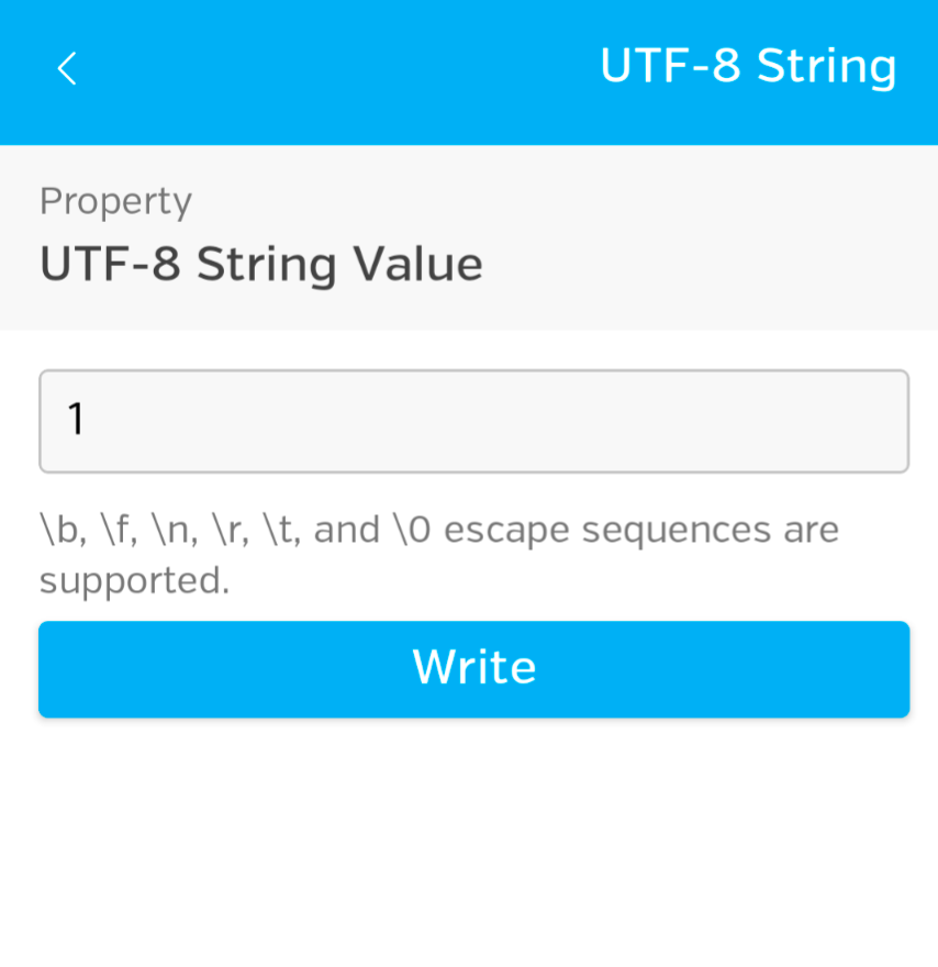 6E400002)→ 點「Write new value」 - 選擇「UTF-8 String」,輸入