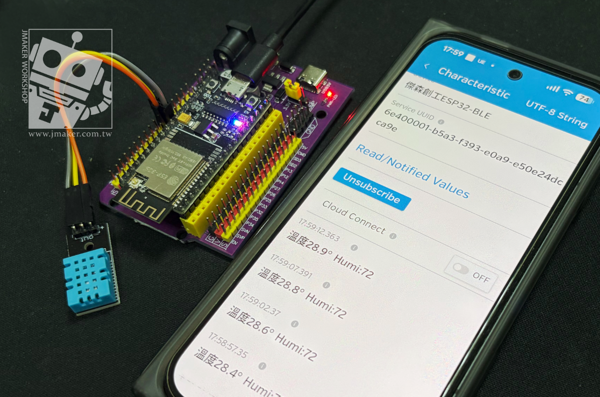 用 ESP32 NimBLE-Arduino 函式庫建立 BLE UART Service,透過標準 UUID 讓 iPhone 與 Android 同時相容。手機傳送指令控制 LED,ESP32 即時回傳確認訊息,並可定時推送 DHT11 溫濕度,實現真正跨平台的藍牙無線通訊。
