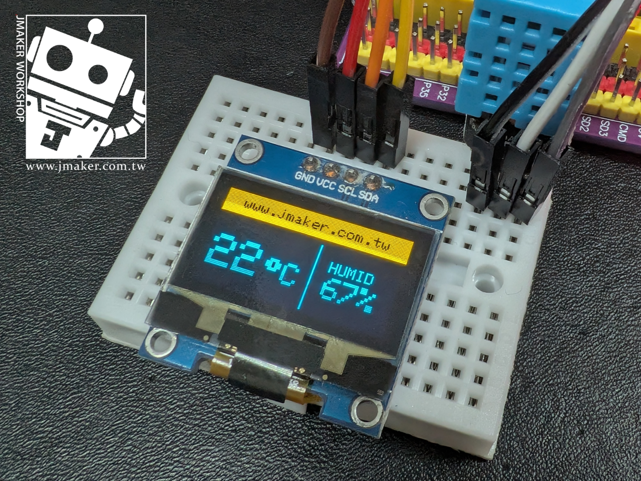 成果展示: 如果一切順利,你的 OLED 螢幕應該會亮起,上方顯示大字體的溫度,中間顯示濕度,最下方則是你設定的網址。試著對感測器哈一口氣,看看數值會不會變化!