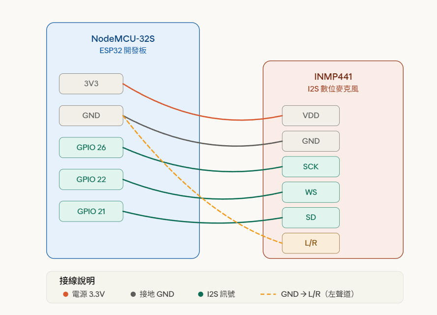 原因 1:L/R 腳位設定不一致 如果 INMP441 的 L/R 接了 GND(左聲道),程式裡的 channel_format 一定要設成 I2S_CHANNEL_FMT_ONLY_LEFT。反過來也一樣,L/R 接 VDD 就要用 ONLY_RIGHT。設錯的話會讀到空資料,聽起來就是雜訊。
