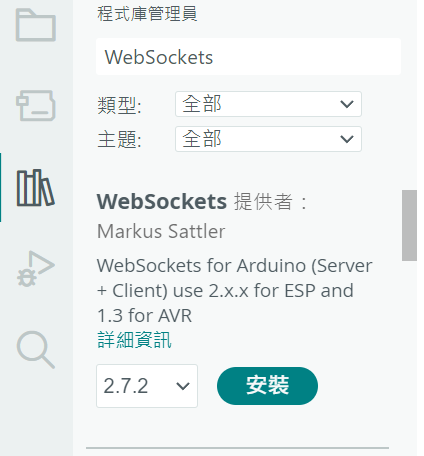 💡 搜尋「WebSockets」時,請認明作者是 Markus Sattler(函式庫名稱為 WebSockets),不要裝錯。