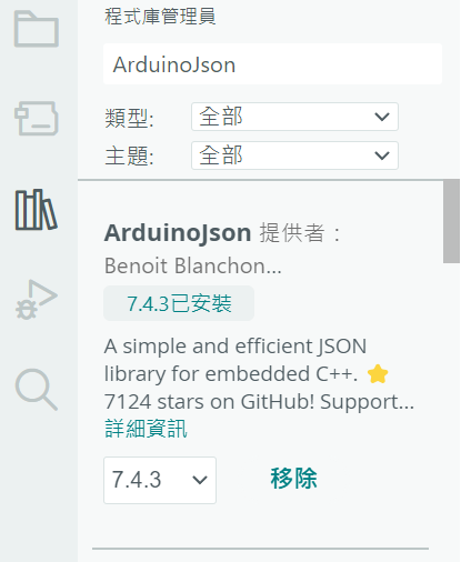 | ArduinoJson | Benoit Blanchon | (選用)JSON 格式處理 |