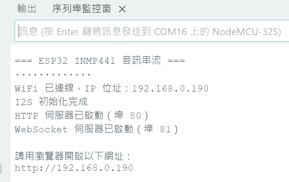 ⚠️ 傑森經驗: 有些 INMP441 模組的有效位元可能稍有不同,如果你聽到的聲音很小聲或很大聲帶破音,可以試著調整右移的位數。把>> 16改成>> 14或>> 11試試看,找出最適合你模組的值。