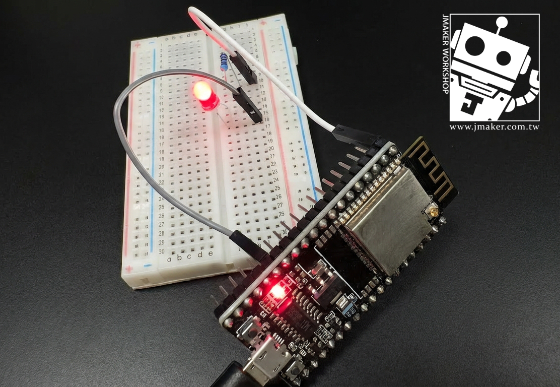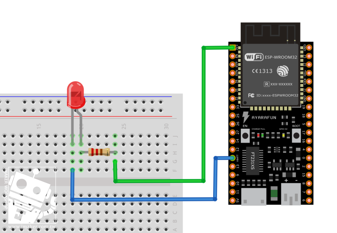 這篇我們從「歐姆定律(Ohm's law)」談起,為 LED 加上適當的電阻,讓它發亮;再來我們撰寫 Arduino 程式,讓麵包板上的 LED 閃爍起來!本篇以 ESP32 NodeMCU-32S 開發板為範例。