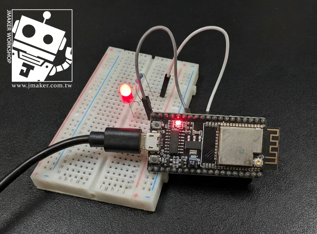 如果你的 ESP32 已經接上 USB 線供電,這時你就會看到 LED 亮起來囉!
