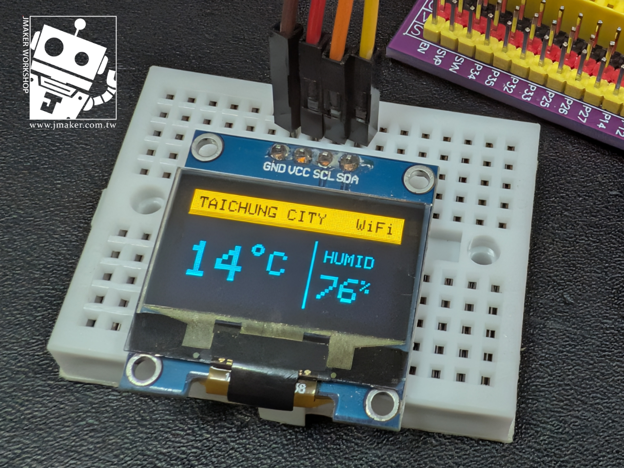 程式主要有幾個部份:連上WIFI,準備好OLED,從Open-Meteo抓取氣象資料,然後顯示在OLED上。