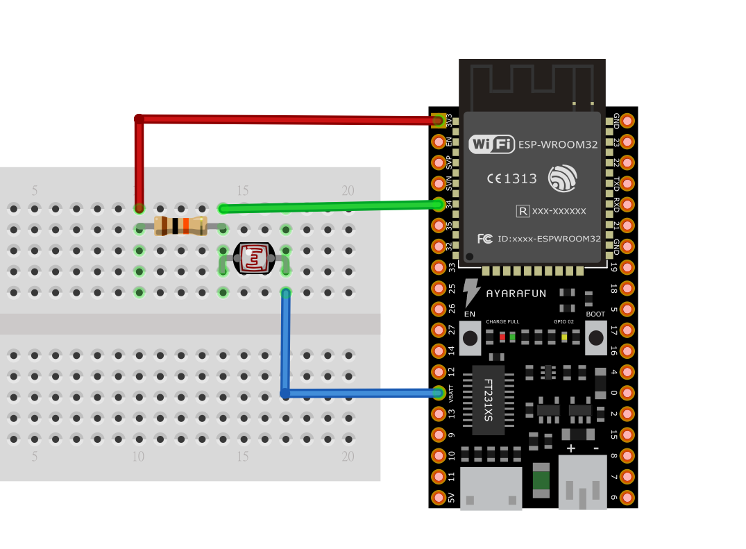 光線越強 → 光敏電阻阻值越小 → GPIO34 分到的電壓越高 → ADC 值越大