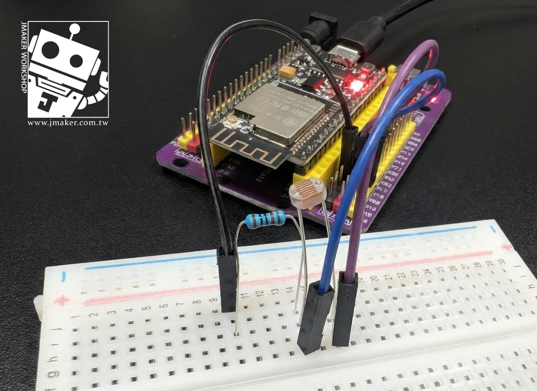 使用 NodeMCU-32S(ESP32)搭配兩腳光敏電阻,透過分壓電路與 ADC 讀取環境光線強度。內容涵蓋電路原理、接線方式、Arduino 程式碼。