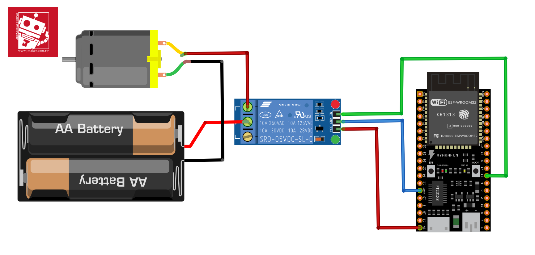 ⚠️ 注意:馬達的電源來自電池盒,不是 ESP32。ESP32 只負責送出訊號控制繼電器的開和關,馬達的驅動電流完全由電池盒提供。這也是繼電器的核心概念:用低功率的訊號去控制高功率的電路。