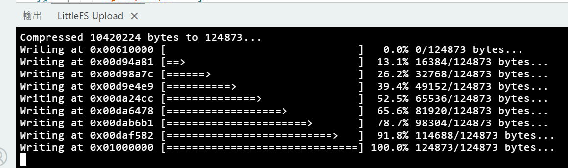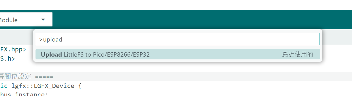 - 執行 LittleFS Data Uploader,按住組合鍵 Ctrl+Shift+p,在輸入框內打upload,就能找到LittleFS Data Uploader,點它就能成功把圖片上傳到開發板了!