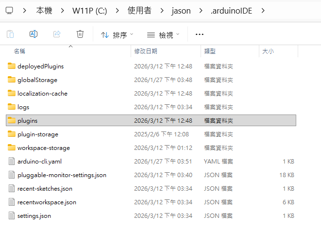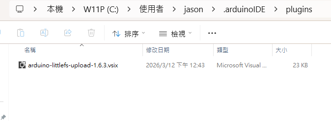 arduino-littlefs-upload下載.vsix檔,並放入磁碟/使用者/(名稱)/.arduinoIDE/plugins資料夾中。安裝後可按Ctrl + Shift + P呼叫指令區使用。 - 如果沒有