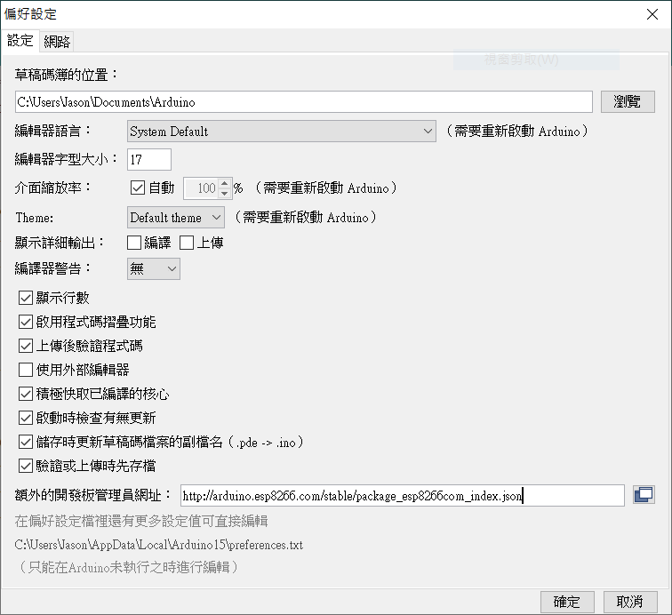 首先在進入「檔案>偏好設定」,在「額外的開發板管理員網址」裡面加上以下的網址: