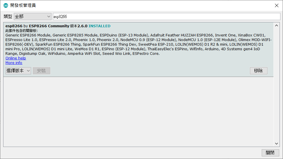 接著再到選單「工具>開發板>開發板管理員」,尋找「esp8266」,就能找到我們要的選項,安裝它就可以了!
