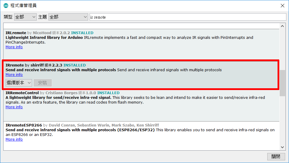 接下來就是安裝紅外線遙控的函式庫了,如果沒有函式庫的幫忙,還真的會有一點小麻煩哦。紅外線遙控的函式不少,但傑森只推薦「IRremote by shirriff」,無敵簡單!