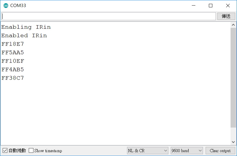 打開函式庫附的範例「IRrecvDemo」,程式很簡單,其實一看就懂了;主要就是設定好紅外線訊號的PIN腳,寫入開發板後,可以打開監控視窗,把遙控器拿來亂按,就會顯示你所按的按鍵代碼,用16進位輸出。
