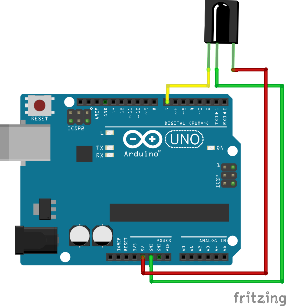 接著把紅外線接收頭的線接好,這部份不難,也就三條線,這次我們把Output端接到pin 7。