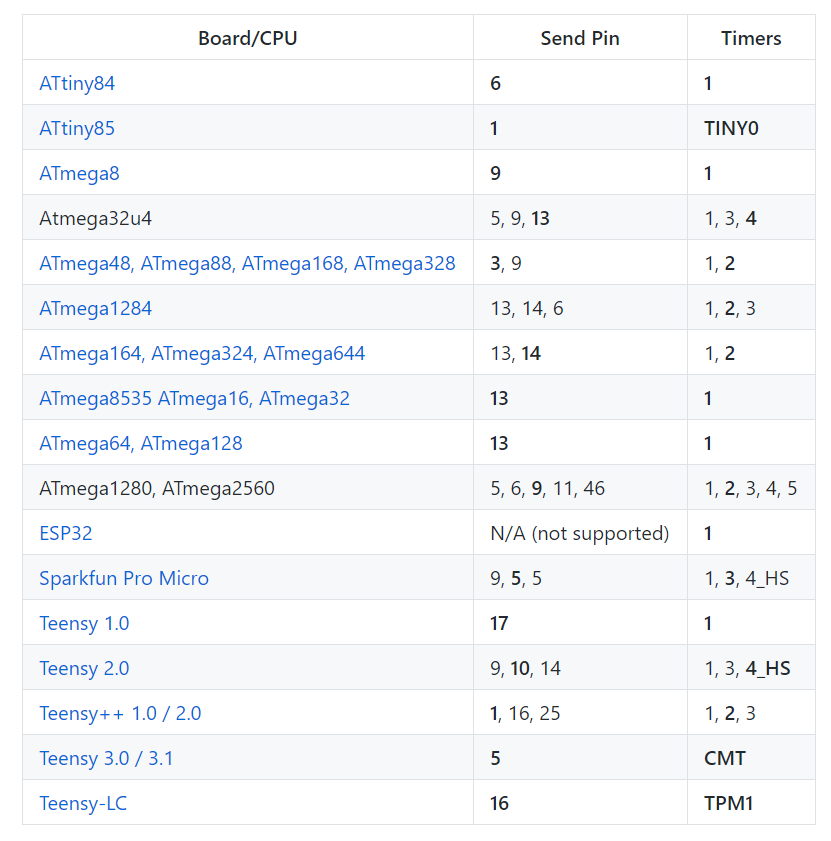 該範例檔頭的地方說明了:「An IR LED must be connected to Arduino PWM pin 3」,這是指像是Uno或是Mega這類常見的板子,要把紅外線LED的VCC端接到pin 3,但像傑森這次用的是Leonardo,就要接到pin 13囉!官方有一個表讓大家參考: