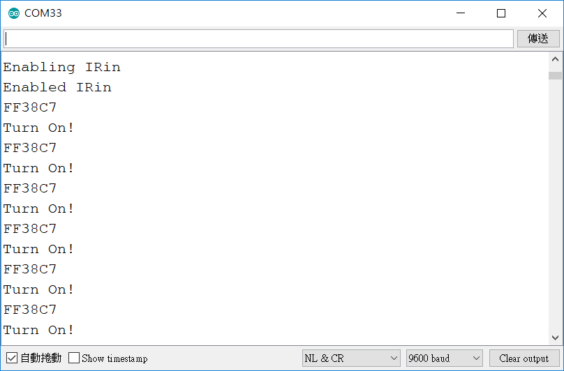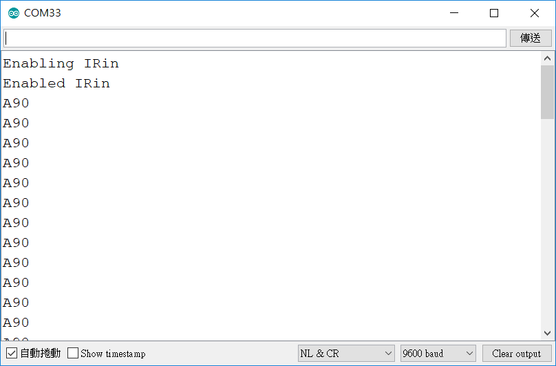 線接好後,就能上傳程式到Arduino囉!這時它會不斷送出一個16進位的0xa90訊息,可以在接收端的監控視窗中看到。