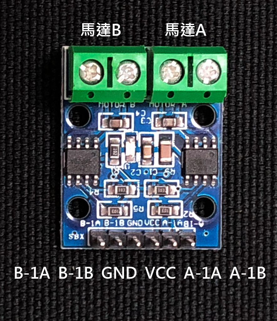 傑森整理了一個L9110S的範例,驅動2顆N20減速馬達,接線很簡單,但常見的這塊板子上面印刷真的很爛XD,所以傑森把文字放大給大家看,應該會有助幫。