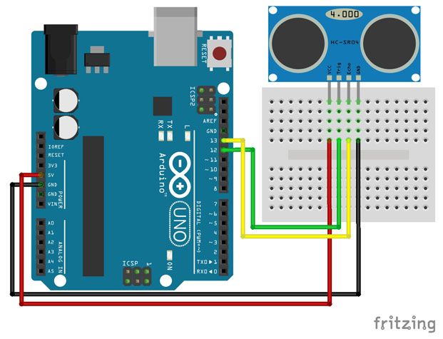 安裝好函式庫,再來就是接線了,VCC接5V,GND接地,Trig接到pin 12,Echo接到pin 13。