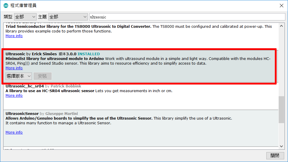 從Arduino的「程式管理員」搜尋SR04,就能找到不少可用的函式庫了。