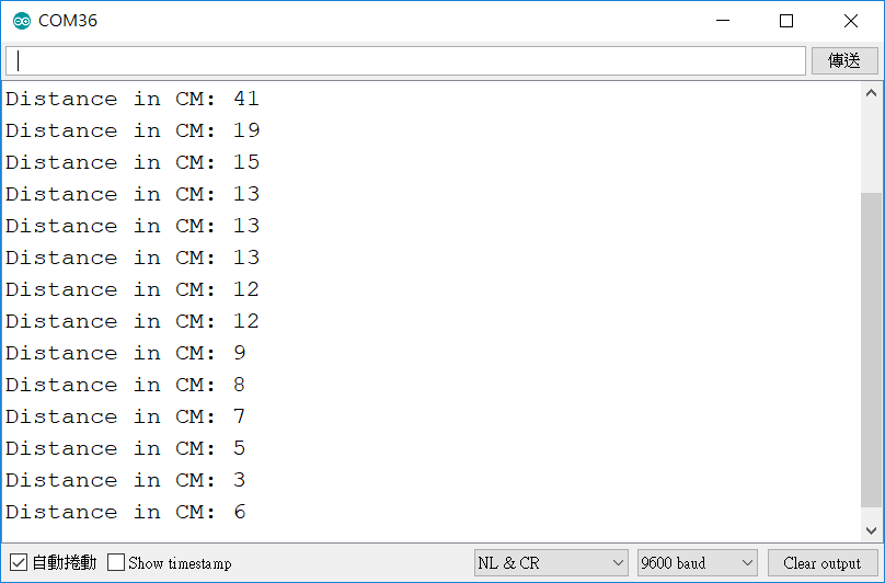 測試結果就簡單的輸出到序列監視窗中,你可以在SR04前面揮手,就能看出距離的數字不斷在變化了。